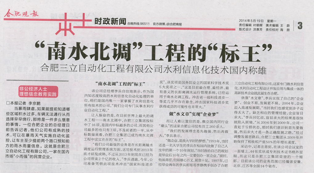 5月19日,《合肥晚報》在顯著版面以《“南水北調(diào)”工程的“標(biāo)王”》為題詳細(xì)報道了此次采訪過程;《合肥日報》、《江淮晨報》也在顯著版面給予了報道。