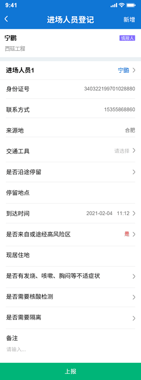 為保障工程進度和返城復工人員生命財產(chǎn)安全,本次全新升級人員報到功能,包括支持人員信息上報關(guān)聯(lián)途徑中高風險地區(qū)、核酸檢測報告。另外考慮到復工人員素質(zhì)高低不一,支持專職人員進行逐一、合并信息代為報到。