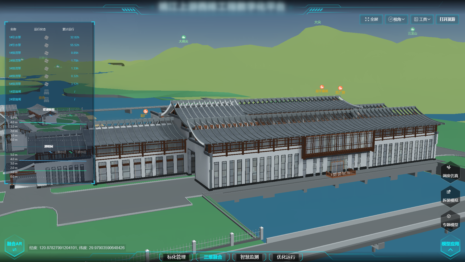 該平臺(tái)在三維GIS大場(chǎng)景下,將與水利工程運(yùn)行管理相關(guān)的監(jiān)測(cè)監(jiān)控、運(yùn)行狀態(tài)、預(yù)警報(bào)警、健康狀態(tài)等信息按照真實(shí)的點(diǎn)位布置到三維模擬場(chǎng)景中,工程運(yùn)管人員可通過(guò)三維模型實(shí)時(shí)監(jiān)測(cè)設(shè)備運(yùn)行狀態(tài),并能鏈接至對(duì)應(yīng)子系統(tǒng)查看詳細(xì)情況。對(duì)于預(yù)警或異常信息的提醒,平臺(tái)設(shè)置精準(zhǔn)定位功能,工程運(yùn)管人員能夠從問(wèn)題出發(fā),瞬間定位到信息所涉及的三維空間,聚焦問(wèn)題部件,從而真正實(shí)現(xiàn)對(duì)工程精細(xì)化、多層次相結(jié)合的高效管理。