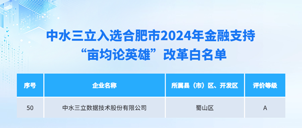 近日,合肥市工信局發(fā)布了《合肥市2024年金融支持“畝均論英雄”改革白名單》,中水三立數(shù)據(jù)技術(shù)股份有限公司憑借其在畝均效益、技術(shù)創(chuàng)新和綠色發(fā)展等方面的突出表現(xiàn),成功入選該白名單。蜀山區(qū)共有49家企業(yè)入選,中水三立榮登前三!