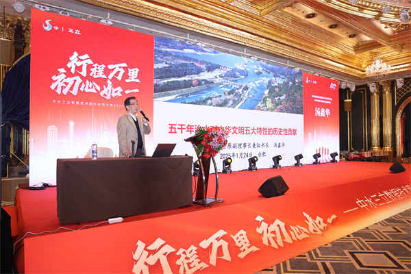 湯鑫華會長則以其淵博的歷史學識,帶來了《五千年治水對中華文明五大特性的歷史性貢獻》專題分享。他從宏大的歷史視角出發(fā),深刻揭示了治水活動在中華文明形成、發(fā)展及繁榮過程中的歷史性貢獻,展現(xiàn)了治水文化所蘊含的深厚智慧與不竭動力。湯會長的分享不僅激發(fā)了現(xiàn)場嘉賓對治水文化的深刻共鳴,更為中水三立人傳承和弘揚企業(yè)文化提供了寶貴的精神財富。