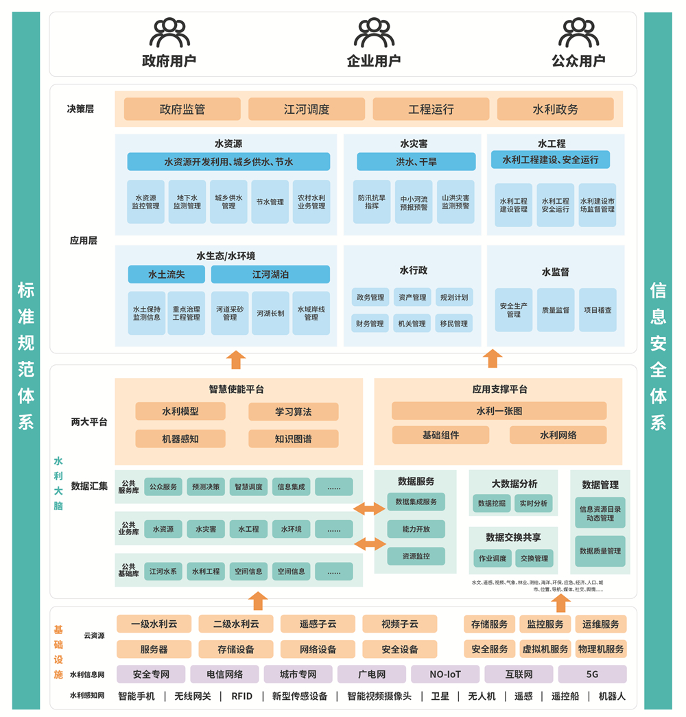 標(biāo)準(zhǔn)規(guī)范:是保障智慧水利的各個(gè)組成部分能夠協(xié)調(diào)一致地工作,是保障各類信息互聯(lián)互通,是保障項(xiàng)目建設(shè)過(guò)程和運(yùn)維管理的規(guī)范、有序、高效的重要基礎(chǔ)。通過(guò)充分利用已有國(guó)標(biāo)和行標(biāo)、參考國(guó)際上的先進(jìn)標(biāo)準(zhǔn)、建設(shè)必要的標(biāo)準(zhǔn)規(guī)范,形成智慧水利標(biāo)準(zhǔn)規(guī)范體系。